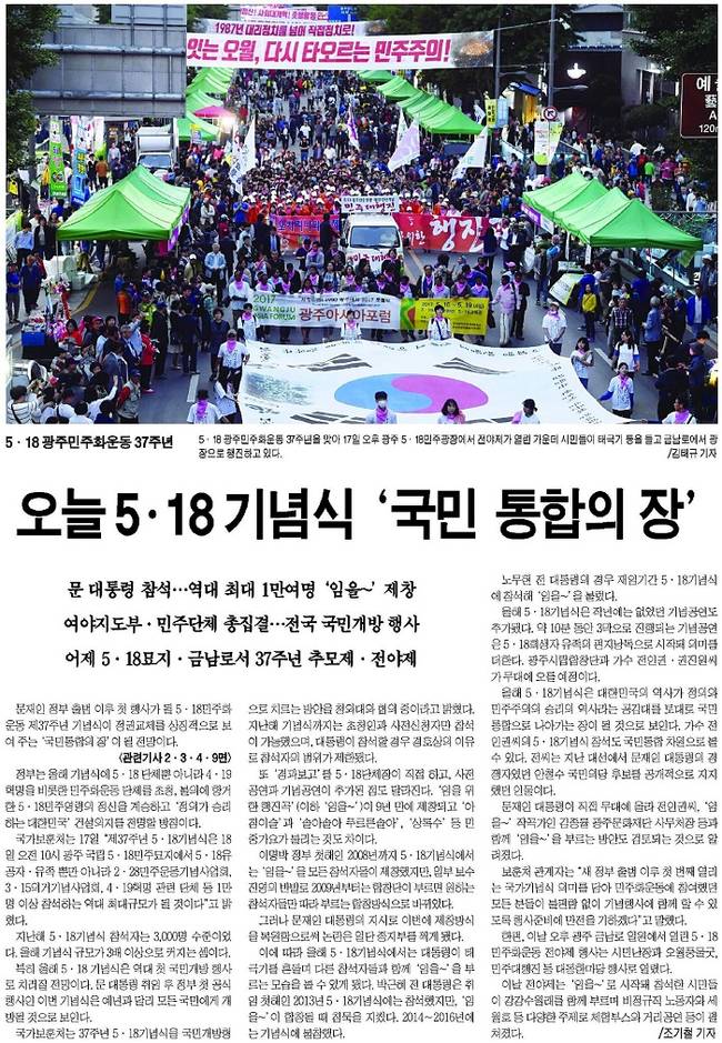 광남일보 광주매일 광주일보 남도일보 무등일보 전남매일 전남일보 등 광주·전남 지역에 기반을 둔 7개 신문은 모두 이날 1면 톱을 5·18 관련 기사로 실었다. 전남매일은 <오늘 5·18 기념식 ‘국민 통합의 장’>이란 제목의 기사에서 “문재인 정부 출범 이후 첫 행사가 될 5·18민주화운동 제37주년 기념식이 정권교체를 상징적으로 보여주는 ‘국민통합의 장’이 될 전망”이라며 “올해 5·18기념식은 대한민국의 역사가 정의와 민주주의의 승리의 역사라는 공감대를 토대로 국민 통합으로 나아가는 장이 될 것으로 보인다”고 보도했다.