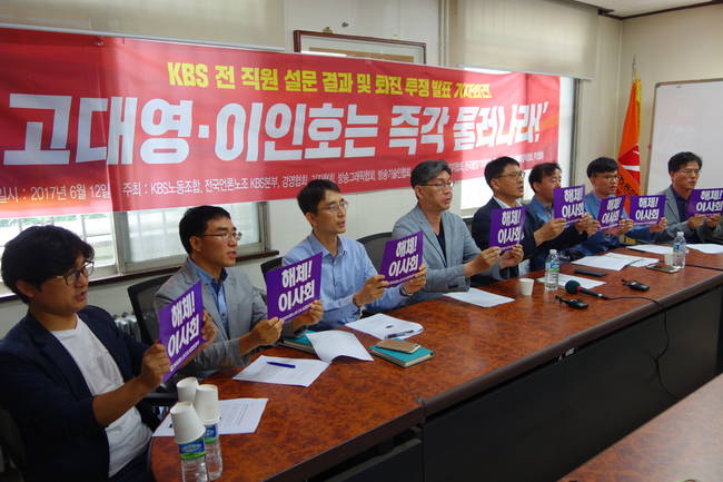 이현진 KBS노동조합 위원장은 이날 기자회견에서 “이번 설문조사는 양대 노조, 모든 협회를 아울러 모든 구성원들이 고대영 사장과 이인호 이사회 체제의 해체를 한 마음 한 뜻으로 모았다는 데 중요한 의미가 있다고 생각한다”며 “KBS정상화는 인적청산이 시급하지만 과제는 제도개선까지 이어져야 한다. 고대영 사장, 이인호 이사장을 즉각 퇴진시키고 청와대가 이사와 사장을 낙점하는 구조까지 바꿔낼 절호의 기회”라고 밝혔다.