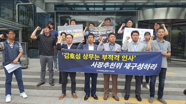 언론노조 YTN지부 노조가 19일 오전 서울 상암동 YTN 사옥 앞에서 기자회견을 열고 사장직에 출사표를 던진 김호성 총괄상무에 대해 즉각 후보 사퇴할 것을 요구했다. 이들은 “김 상무가 후보로 있는 한 사장추천위원회(사추위)는 공정성을 담보할 수 없다”고 지적했다. 노조는 기자회견문에서 “사추위의 기본 개념은 공정성과 독립성에 있다. 하지만 사추위의 5명 중 3명은 YTN의 이사들로, 불과 한 달 전 김 상무를 상무로 선임했던 사람들”이라며 “과반이 YTN 이사로 이뤄진 사추위가 같은 이사회 구성원을 심사하는 촌극을 신뢰할 수 없다”고 명시했다.