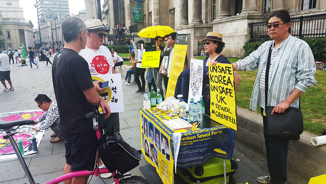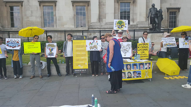 “세월호 사고 한 달 뒤 광장에 나갔어요. 처음엔 정부가 뭔가 발표하겠지 했는데 아니었어요.(대비 김)” 영국은 집회에 사전신고가 필요 없다. 그래서 바로 거리로 나갈 수 있었다. “시위는 그해 12월까지로 생각했어요. 그때까진 정리가 되겠지 했죠.(대비 김)” 하지만 시위는 지금도 이어지고 있다. 학생, 직장인, 교수, 영국 시민 등 참여층도 다양해졌다. 피켓을 들고 오가는 사람들에게 전단지를 나눠주고 세월호에 대해 설명해주는 식이다. 퍼포먼스를 할 때도 있다. “(영국인들이) 저에게 와서 우리나라(영국)에 원하는 게 무엇인지 묻더군요. 저는 ‘없다, 그저 알고 있으면 됐다’고 했어요. 여기서도 대부분 세월호 사고를 기억하지만 선장이 체포됐다는 게 최종 버전입니다.(앤드류)”