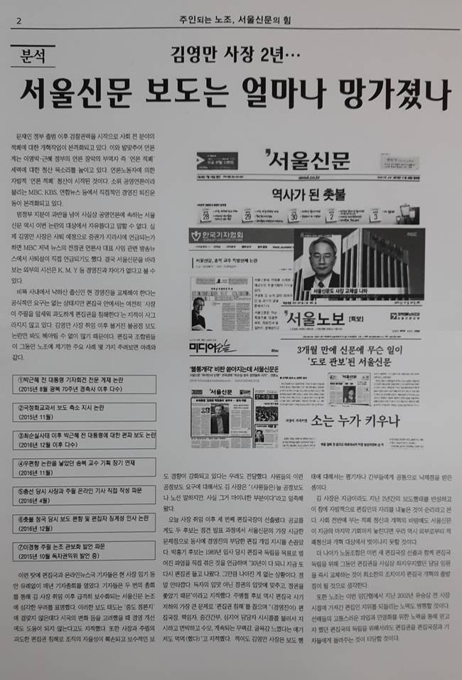 그러면서 "국장이 인사에 영향을 미치지 못하면 어떻게 지휘권을 원활히 행사하고, 부장들과 함께 서울신문사의 핵심 콘텐츠인 뉴스를 잘 생산할 수 있을지 의문"이라며 "(김 사장의) 취임 초기부터 진행됐던 서울신문의 ‘우경화’라는 ‘헛발질’이 정권 교체 이후에도 계속될 것이라는 우려도 있다. 이는 경영진이 전가의 보도로 내세우는 ‘해사행위’와 얼마나 다른지 묻고 싶다"고 했다.