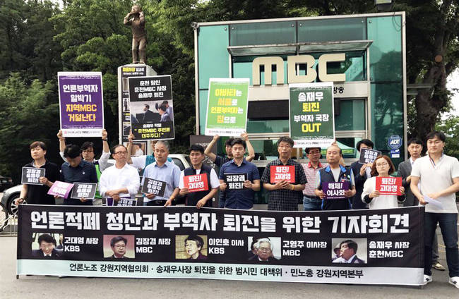 김장겸 MBC사장에 대한 퇴진 요구가 사그라들지 않는 가운데 대전·춘천 등 지역 MBC에서도 공영방송 파탄의 책임을 물어 지역MBC 수장의 사퇴를 촉구하는 목소리가 거세다.