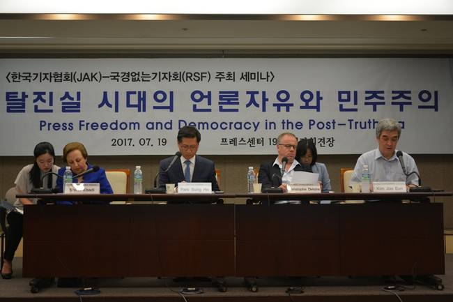 크리스토프 들루아르 국경없는기자회(RSF) 사무총장은 19일 한국기자협회와 RSF가 공동으로 개최한 ‘탈진실 시대의 언론자유와 민주주의’를 주제로 열린 세미나에서 “전체주의 국가뿐만 아니라 민주주의 국가에서조차 언론자유가 후퇴하고 있다”고 말했다.