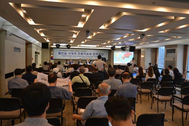 김 고문은 “보수정권 치하에서 한국의 언론자유는 급격히 위축됐다. 인터넷 사후검열과 전략적 봉쇄소송, 언론인 해고와 중징계 등으로 언론자유 순위는 30위에서 70위 수준으로 하락했다”며 “한국기자협회와 전국언론노조 등 현업인단체들은 물론 시민단체들도 언론개혁을 적폐청산의 중요한 과제로 설정하고 연대운동을 펼치고 있다”고 소개했다.