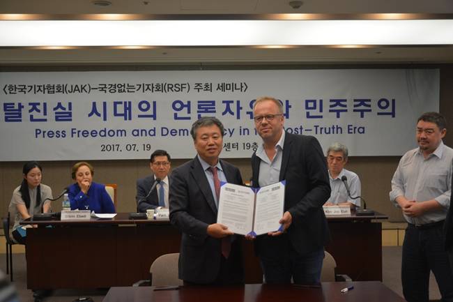 한편 한국기자협와 국경없는기자회는 이날 정보의 자유 수호 및 언론인 보호를 위한 업무협약을 체결했다.