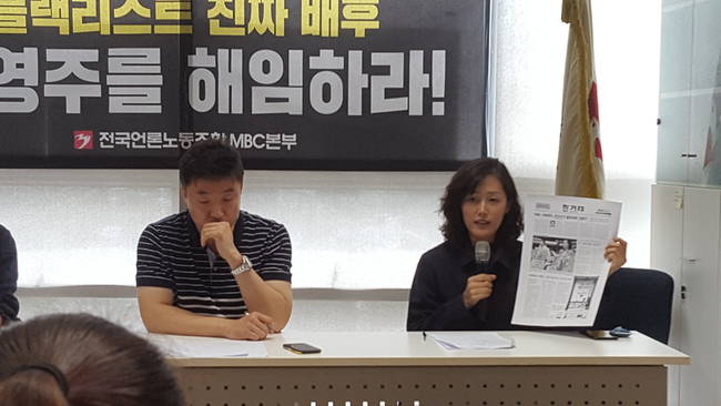 지난 5년간 마이크를 잡지 못하고 있는 박경추 아나운서와 김수진 기자도 기자회견장에 참석해 사측의 블랙리스트 실체를 폭로했다. 박 아나운서는 “아나운서는 방송을 하지 못한다는 것 자체로 아나운서의 생명을 빼앗는 것이다. 버티고 퇴사하는 과정을 거치며 MBC 아나운서국은 조직이 철저히 망가졌다”고 전했다.