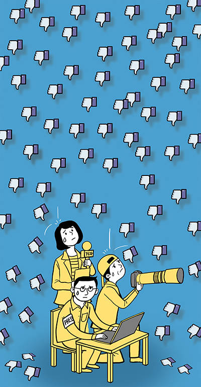 당시 전통매체의 파급력, 아니 기자의 파워는 과거 미디어 이용시간에서도 드러난다. 언론재단의 ‘2016 언론수용자 의식조사’에서 1993년 텔레비전과 종이신문의 이용시간은 각각 172분과 42.8분이었으나 2016년 현재 TV는 22.2분 줄어든 149.8분, 종이신문은 10분이 채 안 되는 6.5분을 기록하고 있다. 종이신문 열독률 역시 1996년 85.2%에서 2016년 20.9%까지 가파른 하락곡선을 그린다. “(지상파 중 후발주자였던) SBS 뉴스만 해도 평균 시청률이 15%에 육박했던 때”와 지금은 엄연히 다른 것이다.