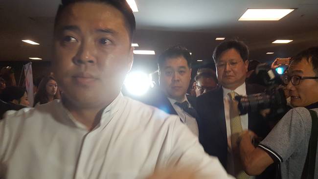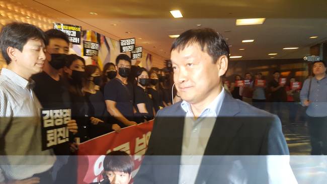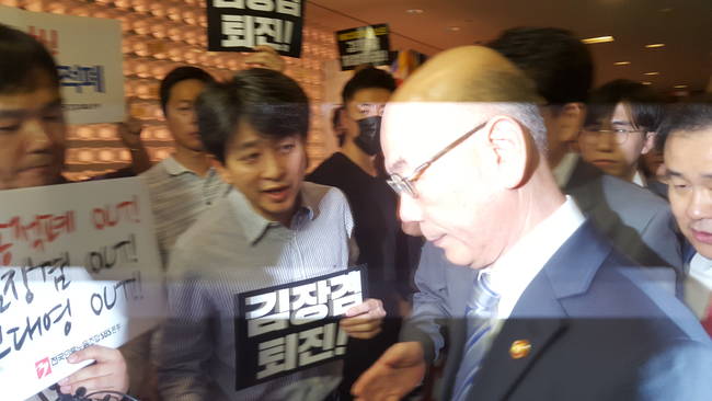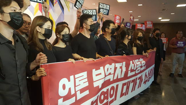 이날 김환균 언론노조 위원장을 비롯해 윤창현 SBS본부장, 지정구 한겨레지부장, 한대광 경향신문지부장, 이주영 연합뉴스지부장 등도 수백여명의 기자, PD, 아나운서와 함께 행사장 밖에서 “김장겸은 물러나라, 고대영은 물러나라”는 구호를 외쳤다.