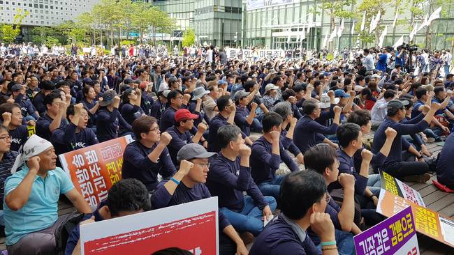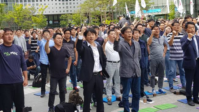 4일 0시를 기해 총파업에 돌입한 전국언론노조 MBC본부가 이날 오후 2시 '김장겸 체제 퇴장, 공영방송 재건을 위한 합동 출정식'을 열었다. 서울 상암 MBC 사옥 앞 광장에 모인 MBC본부 서울지부, 지역MBC 17개 지부 조합원 1500여명은 "김장겸 퇴진, MBC 정상화"를 연호하며 결의를 다졌다.
