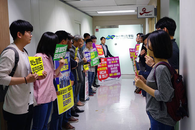 이어 전국언론노조 연합뉴스지부 비대위, 대의원, 조합원, KBS·MBC 정상화 시민행동 회원 등이 참석한 가운데 ‘박노황 사장과 경영진 해임촉구’ 기자회견을 개최했다.