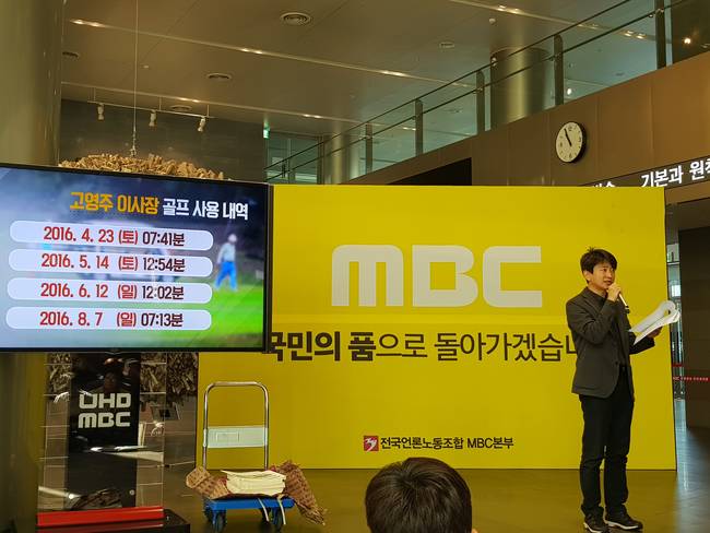 김연국 전국언론노조 MBC본부장은 17일 서울 상암동 MBC 로비에서 열린 기자회견에서 “이 사건은 단순한 골프접대가 아니다. 김기춘과 부적절한 호화접대를 즐긴 이후 MBC 뉴스는 최순실 국정농단에 대해 침묵했고 진실을 은폐했으며 특검 수사를 방해했다”며 “이는 형사처벌 대상뿐만 아니라 공영방송 이사장으로서 독립성을 위반한 명백한 해임 사유”라고 폭로했다.