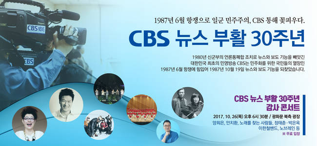 한편 CBS는 뉴스부활 30주년을 맞아 서울 광화문 광장에서 감사 콘서트를 갖고 라디오와 TV를 통해 다양한 특집 프로그램을 방송한다. 오는 26일 광화문 북측 광장에서 ‘6월 항쟁 30년, CBS 뉴스부활 30년 감사 콘서트’라는 제목으로 개최되는 콘서트에는 각계 인사의 축사와 CBS 언론인 선언에 이어 양희은, 안치완, 이한철밴드 등의 축하 공연이 열린다.
