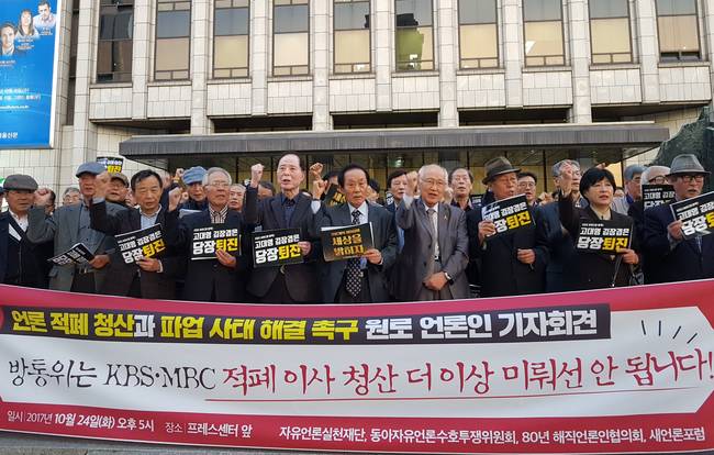 1974년 10월24일 동아일보 언론인들이 유신독재에 저항하며 발표한 '자유언론실천선언' 43주년을 맞은 이날 동아자유언론수호투쟁위원회, 자유언론실천재단, 80년해직언론인협회, 새언론포럼 등 원로언론인들은 서울 중구 프레스센터 앞에서 기자회견을 열고 공영방송 정상화를 위해 방통위가 결단해야 한다며 이같이 밝혔다.