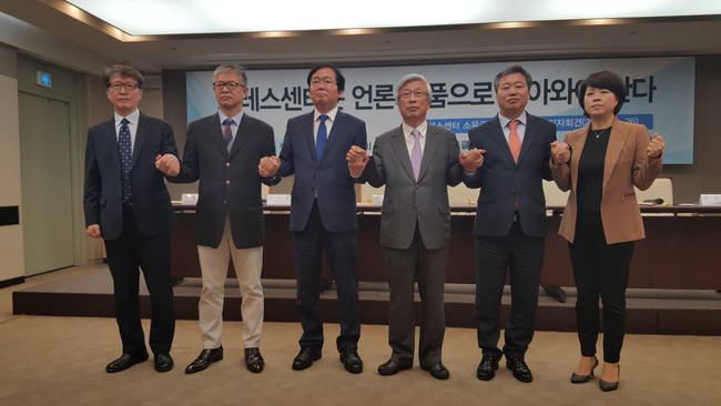정규성 한국기자협회 회장, 이병규 한국신문협회 회장, 이하경 한국신문방송편집인협회 회장, 박제균 관훈클럽 총무, 채경옥 한국여기자협회 회장, 김종원 한국신문윤리위원회 사무국장은 26일 서울 중구 한국프레스센터 19층 기자회견장에서 기자회견을 열고 “프레스센터는 시설의 역사성으로 보나 설립 취지로 보나 명명백백한 ‘언론의 전당’이며 공적 자산”이라면서 “마땅히 언론계 품으로 돌아와야 한다”고 밝혔다.