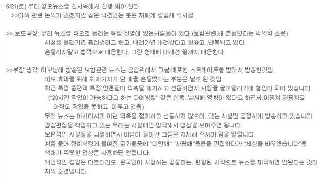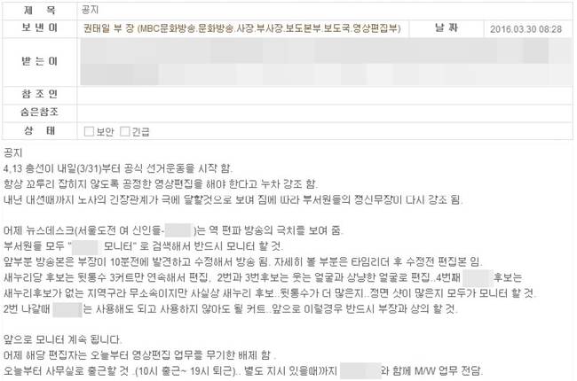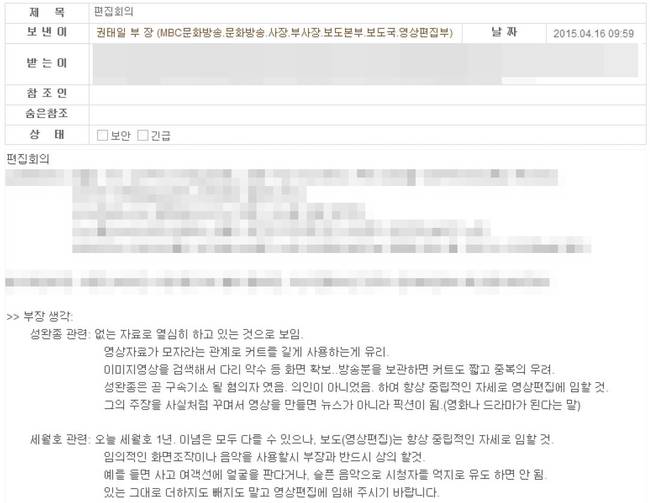 또 ‘이념이 들어간 그림을 자제해라’ ‘팻말과 리본 등의 글 내용을 참고하라’ ‘고의적이든, 몰라서 그랬든 정치적인 행동을 해서 논란의 중심에 서지 말라’는 등의 구체적인 지시도 내려진 것으로 확인됐다. 세월호 참사 1년을 맞은 지난 2015년 4월 16일에는 ‘임의적인 화면조작이나 음악을 사용할 시 부장과 상의하라’ ‘슬픈 음악으로 시청자를 억지로 유도하면 안 된다’는 지시가 내려졌다.