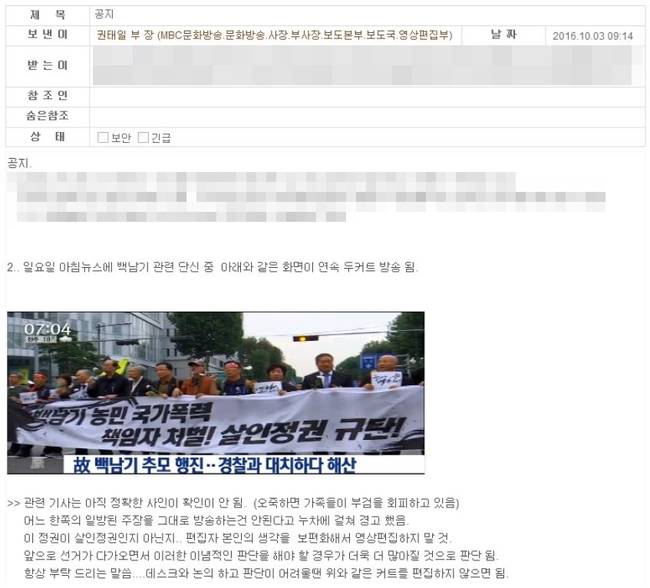 백남기 농민 사망 사건에도 영상지침이 있었다. 노조는 “백남기 농민이 물대포에 맞아 쓰러지는 장면이 담긴 ‘노컷뉴스’의 영상이 경찰 과잉진압의 증거가 되는 결정적 자료인 만큼, 우리도 해당 영상을 확보하고 있었다. 하지만 권 부장은 이 영상이 ‘외부영상’이라며 사용하지 말라고 메일로 지시했다”며 “결국 뉴스데스크 리포트에 영상은 나가지 않았다. 대신 집회 폭력성을 부각시키기 위해 참가자들이 줄로 경찰차를 묶어서 끄는 장면, 유리창을 깨는 장면 등을 위주로 리포트가 구성됐다”고 말했다.