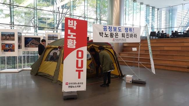 연합뉴스 바로세우기 비상대책위원회(이하 비대위)가 2일부터 연합뉴스 사옥 1층 로비에서 박노황 사장 등 경영진 퇴진을 요구하는 무기한 천막 농성에 돌입했다.
