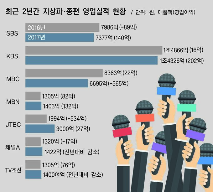 MBC의 경우 지난 2014년 270억원의 적자를 낸 데 이어 지난해 또다시 큰 폭의 손실(-565억원)을 기록했다. 이명박-박근혜 정권에 들어서면서 경영진이 정부비판 보도를 묵인 축소하는 등 꾸준히 보도 논란을 일으켜온 MBC로서는 신뢰 하락이 수익 악화의 근본적인 원인으로 꼽힌다. 지난해 광고시장이 호황일 때 총파업에 돌입하며 보도와 드라마, 예능 등이 ‘올스톱’된 것도 적자난에 한몫했다. MBC 관계자는 “2016년 대비 광고 매출이 약 1000억원 빠졌고 프로그램판매 매출도 500억원 가량 줄었다”고 설명했다.