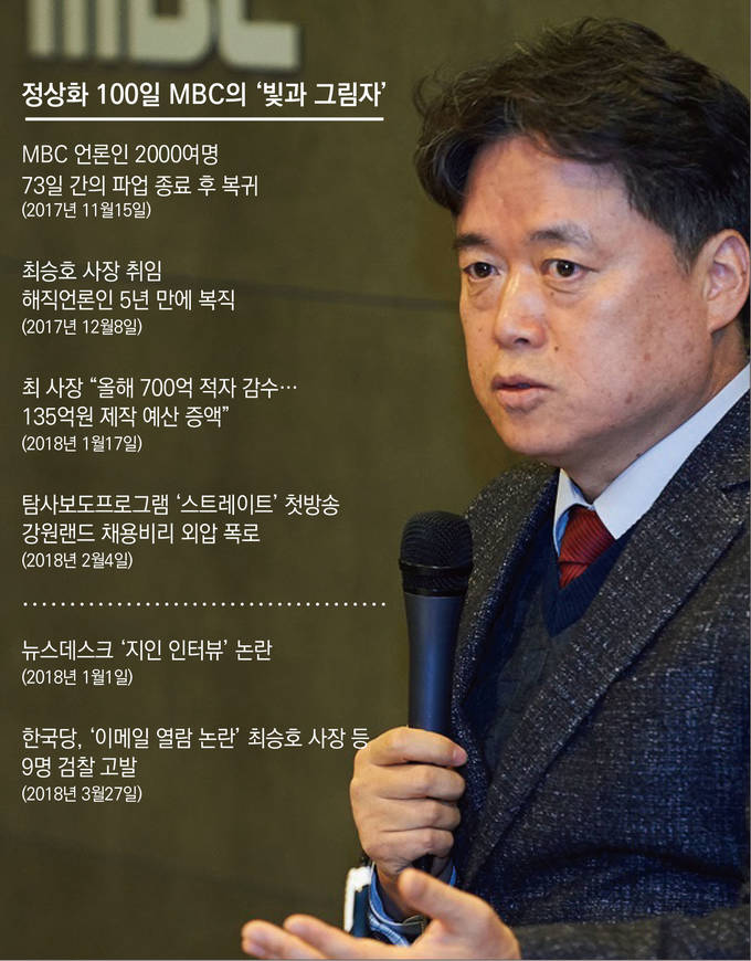 MBC 정상화를 바라보는 언론계의 기대는 여느 때와 다르지 않다. 청산만큼 ‘재건’에 무게를 둬야한다는 목소리가 나오는 이유다. 보도국이 전열을 가다듬고 지난해 12월26일 박성호-손정은 앵커 체제로 뉴스데스크를 개편한 것도 이런 취지다. 물론 초반에 ‘소방관 CCTV 보도’ ‘지인 인터뷰 활용 리포트’ ‘문재인 신년 기자회견 10꼭지 보도’ 등은 논란거리로 남았다. MBC의 C 기자는 “실수가 계속 나오면서 ‘보도를 신중히 해야 한다’는 데 의견이 모아졌다. 근본적인 관행을 바꿔야한다는 얘기도 나왔다”고 했다.