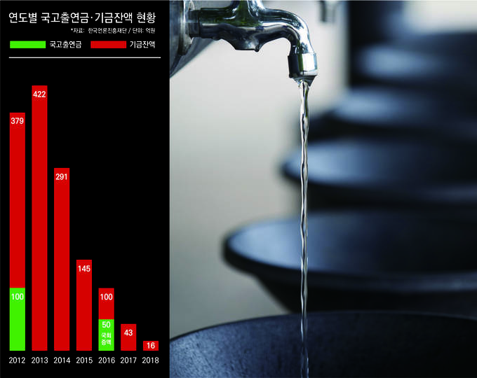 기금 고갈은 지난 2013년 박근혜 정부 이래 국고출연금이 전무하다시피 한 탓이다. 기금은 국고출연금과 언론재단 법인출연금을 주 재원으로 하는데, 지난 6년 간 국고출연금이 0원에 수렴하면서 언론재단 출연금으로 충당하던 기금이 한계에 이르렀다. 지난 2016년 50억원이 국고출연됐지만 국회에서 증액돼 반영된 것이었다. 최근 9년 간 출연 규모를 봐도 언론재단 법인출연 규모는 1032억원이었지만 국고출연은 285억원에 불과했다.