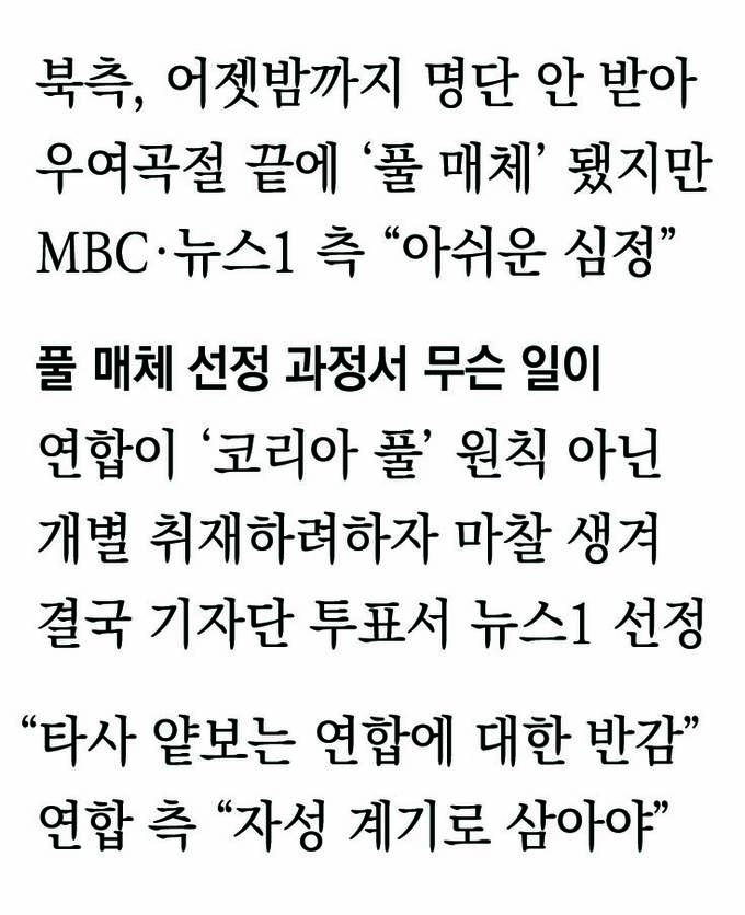 이번 풀 매체 선정 과정에선 외교부 출입 기자단 사이에 약간의 진통도 있었던 터다. 방송사의 경우 외교부 출입 기자단에 속한 12개 방송사 ‘추첨’으로 일찌감치 MBC가 선정됐지만 통신사 선정을 두고 갈등이 있었다. 연합뉴스의 풀 방침을 두고 출입기자단 매체의 반발이 컸다.