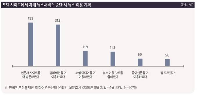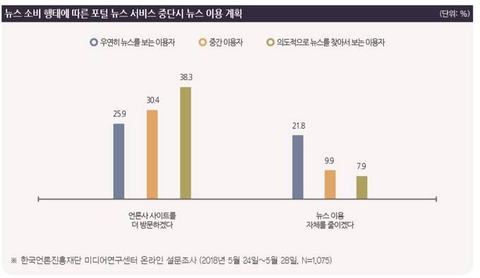 포털이 자체 뉴스 서비스를 중단해도 뉴스 소비가 크게 줄지 않고, 기성 매체 이용자가 늘어나는 효과가 나올 수 있다는 이용자 조사결과가 나왔다. 우연히 뉴스를 보는, 소극적 뉴스 이용자들의 뉴스 소비는 줄어들 수 있지만 의도적으로 뉴스를 찾아보는, 적극적 이용자들은 기존 언론을 더 적극적으로 활용할 것이란 점도 나타났다.