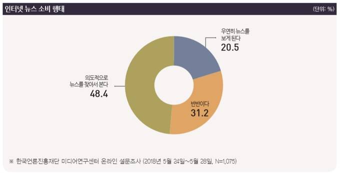 이와 관련해 포털 뉴스 서비스 중단 시 뉴스 적극 이용자들은 기성 언론을 더 적극적으로 활용할 것이란 분석도 나왔다. 우선 기존 뉴스소비 방식에 대한 조사결과 우리 국민들의 뉴스 소비가 비교적 적극적인 형태로 이뤄진다는 점이 드러났다. 응답자의 과반에 달하는 48.4%가 ‘의도적으로 뉴스를 찾아서 본다’고 했다. ‘우연히 뉴스를 보게 된다’는 응답자 20.5%, ‘반반’이라고 답한 응답자가 31.2%였다.