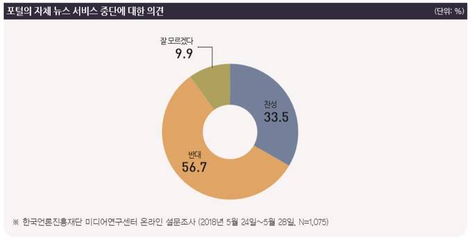 다만 포털 사이트에서 자체 뉴스 서비스를 중단해야 하는지 의향을 묻는 질문에는 반대 목소리(56.7%)가 많았다. 찬성이 33.5%였음을 감안하면 반대가 20%이상 높은 결과다. 일반 국민 상당수는 이미 익숙해진 포털 뉴스 서비스를 선호한다는 점이 드러났다.