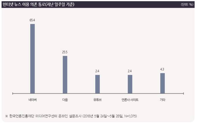 아울러 이번 연구에선 국민들이 포털 네이버와 다음을 이용하는 근간에 ‘뉴스’와 ‘시사 정보’가 있음을 보여주는 결과도 담겼다. 이용자들에게 일주일 동안 인터넷으로 뉴스나 시사정보를 이용할 때 주로 접속한 사이트가 어디인지를 묻는 질문에 네이버(65.4%)와 다음(25.5%)이 압도적인 것으로 나타났다. 반면 같은 기간 언론사 사이트(특정 언론사 아닌 모든 언론사)에 방문한 응답자는 20.7%였다.