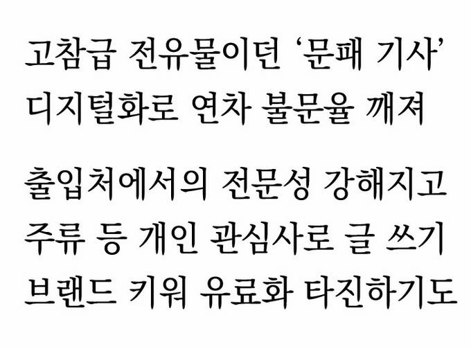 기자 이름을 문패로 내건 기사들이 속속 등장하고 있다. 과거 주로 고참기자 칼럼에 붙던 ‘[○○○ 기자의 △△△△]’이 연차를 불문하고 기자의 전문성을 강조하는 수단으로 자리 잡았다. 지금 언론계에선 ‘문패 기사’를 활용한 기자 브랜딩 대전이 펼쳐지는 모양새다.
