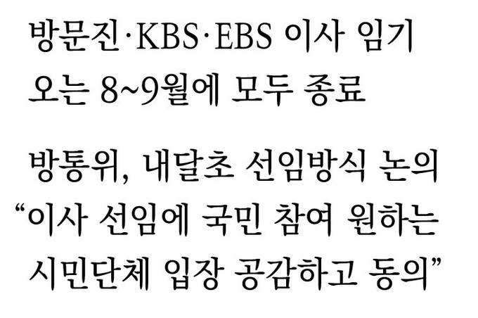공영방송 이사회 임기 만료를 앞두고 방송통신위원회가 공영방송 이사 선임 과정을 투명하게 공개하고 시민 참여를 보장해야 한다는 언론시민사회의 요구가 높아지고 있다. 촛불정신을 이어받은 문재인 정부 출범 이후 처음 이뤄지는 공영방송 이사진 개편인 만큼 방통위가 기존의 ‘밀실 선임’ 관행을 깨고 언론계 요구를 어디까지 수용할 수 있을지 주목된다. 오는 8월이면 MBC 최대주주인 방송문화진흥회와 KBS 이사회 임기가 만료된다. EBS 이사회 임기도 9월까지다. 방문진, EBS 이사 임면권과 KBS 이사 추천권을 가진 방통위는 다음달 이들 공영방송 이사 선임을 위한 절차에 돌입해야 한다. 방통위 관계자에 따르면 다음달 2일 열리는 상임위원 간담회에서 공영방송 이사 선임 방식이 논의될 것으로 알려졌다.