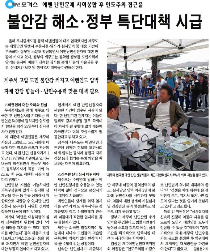 지난 12일엔 한라일보에서도 출도 제한 명령으로 제주 체류가 불가피한 예멘인들이 입국 한 달 만에 생활비를 모두 소진해 생계난을 겪고 있다는 기사를 보도했다. 예멘인들을 바라보던 불안한 시선은 “예민 난민 껴안는 취업 조치는 바람직” “국제사회 일원으로서 당연한 의무” 등으로 완화됐다.