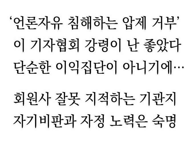 혈기왕성하던 한때, 강령에서 ‘권익옹호’ 구절을 통째로 빼자고 우겼다. 세습권력이 된 언론의 환부, 갑질하는 언론인의 치부를 들추면 그 언론사 소속이거나 당사자와 말싸움하는 짓에 지쳐서 투덜거린 볼멘소리였다.