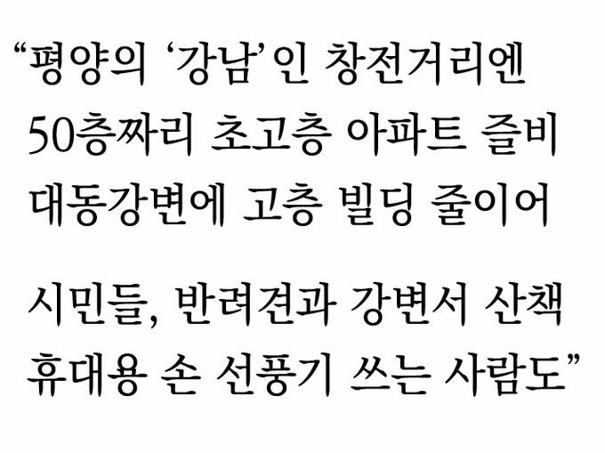기자들이 마주한 평양엔 엄청난 변화의 바람이 불고 있었다. 북한이 자랑하는 미래과학자거리를 비롯해 평양의 강남이라 불리는 창전거리엔 기본 40~50층의 아파트들이 즐비했다. 여명거리엔 70층짜리 아파트도 있었다. 숙소인 양각도 호텔에서 바라본 대동강변엔 모두 다른 디자인의 고층빌딩이 끝없이 보였다. 사람들의 표정도 밝고 여유로웠다. 김희남 기자는 “대동강변엔 아침저녁으로 반려견 끌고 산책하는 사람들이 꽤 있었다”며 “‘손풍기(휴대용 핸디선풍기)’를 들고 다니는 사람들도 있더라. 제재 속에서도 장마당을 통해 중국 공산품이 흘러들어오고 있다는 것”이라고 말했다.