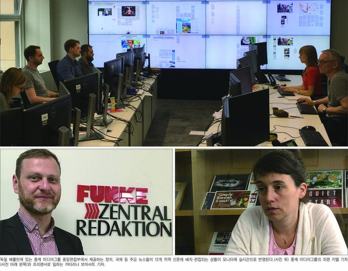 지난달 6일 방문한 독일의 풍케(Funke) 미디어 그룹도 바로 그 언론 재벌 중의 하나다. 풍케 그룹은 주로 잡지를 만드는 곳이었으나, 약 4년 전부터 각 지역의 신문사들을 사들이기 시작해 지금은 총 12개 신문을 소유하고 있다. 이들 12개 신문은 베를린에 있는 풍케 그룹 중앙편집부에서 제공하는 기사를 공급받아 제작한다. 정치, 국제, 과학 등 주요 분야 뉴스는 중앙편집부에서 제공하고, 지역 뉴스와 사설, 논평 등만 각 지역에서 직접 제작하는 구조다. 12개 신문의 발행부수를 합치면 약 140만부. 이 판매 부수를 무기로 메르켈 총리 같은 주요 정치인에게 인터뷰를 요구할 수 있는 권위와 영향력을 갖는 셈이다. 비용 절감 측면에서도 효율적인 전략이지만, 그 대가로 지역 신문에서 일하던 많은 기자들이 일자리를 잃었다.