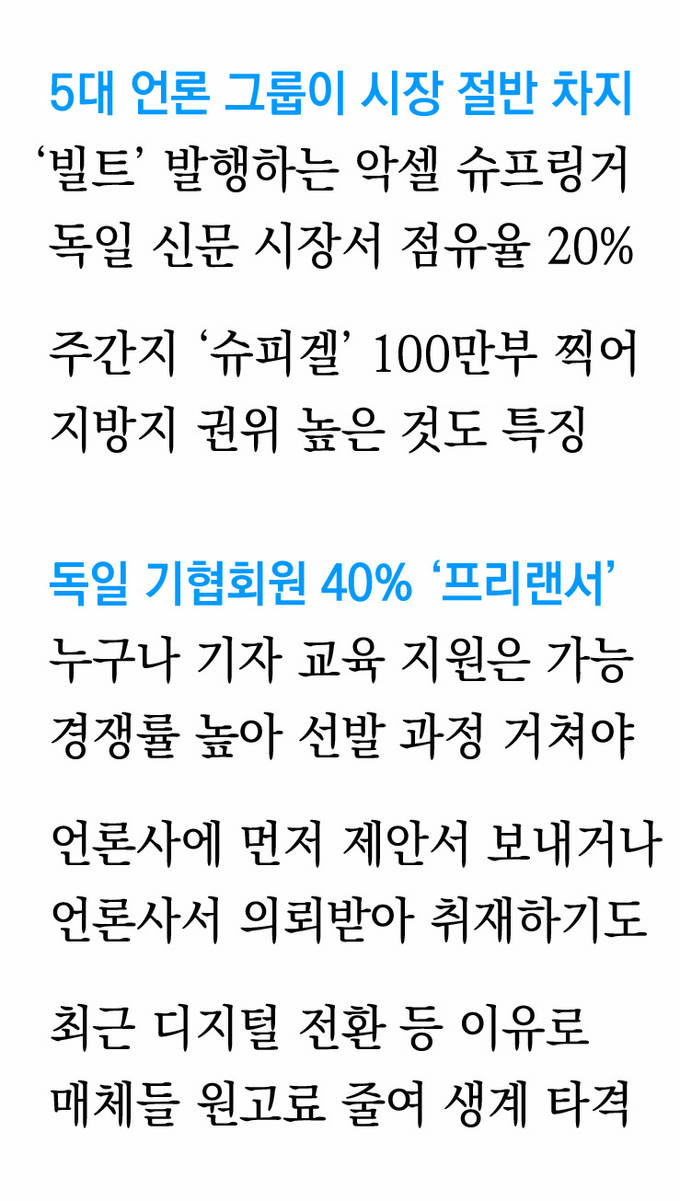 독일의 신문 시장은 서유럽에서 가장 큰 규모다. 독일을 넘어 유럽 최다 발행 부수를 자랑하는 타블로이드지 ‘빌트’가 건재하고, 시사주간지 ‘슈피겔’은 100만부 안팎의 발행부수로 권위와 영향력을 자랑한다. 정치적 스펙트럼이나 매체 형태도 다양하고, 지방지의 권위도 높은 편이다. 또 하나 독일 신문 산업의 두드러진 특징은 집중화다. 거대 미디어 그룹이 복수의 신문과 잡지를 발행하며 시장 점유율을 독점하는 방식이다. 대표적으로 ‘빌트’를 발행하는 독일 최대 신문기업 악셀 슈프링거의 일간신문 시장 점유율은 20% 정도를 차지하며, 악셀 슈프링거를 포함한 5대 언론 재벌 그룹의 시장점유율은 절반에 가까운 것으로 알려졌다.