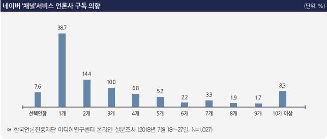 한국언론진흥재단 미디어연구센터가 내달 초로 예정된 네이버의 뉴스 서비스 개편을 앞두고 전국 성인 남녀 1027명을 대상으로 온라인 설문조사를 실시한 결과, ‘채널’ 서비스에서 구독할 의향이 있는 언론사로 총 3691개가 선택되어(중복응답) 1인 평균으로는 3.59개 언론사 채널을 구독할 의향이 있는 것으로 나타났다.