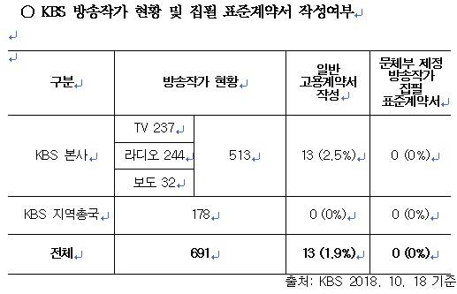 KBS 방송작가 중 고용계약서를 작성한 비율이 1.9%에 불과한 것으로 드러났다. 그마저도 정부가 내놓은 ‘표준계약서’로 체결한 경우는 단 한 건도 없는 것으로 나타났다.