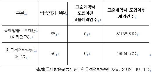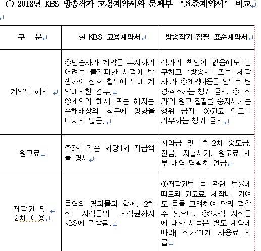 두 계약서를 비교해보면 계약해지, 원고료, 저작권 등 측면에서 작가가 받는 대우에는 상당히 큰 차이가 있다. 현재 아리랑TV(국제방송교류재단)와 KTV(한국정책방송원)의 경우 앞선 방침에 따라 방송작가와 계약을 시행하고 있는 상태다.