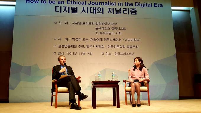지난 14일 서울 중구 한국프레스센터 20층 국제회의장에서 ‘디지털 시대의 저널리즘’을 주제로 새뮤얼 프리드먼 컬럼비아대 교수의 초청 강연이 열렸다. 새뮤얼 프리드먼 교수는 뉴욕타임스 기자 출신이자 현 뉴욕타임스 칼럼니스트로 ‘미래의 저널리스트에게’의 저자로도 유명하다.