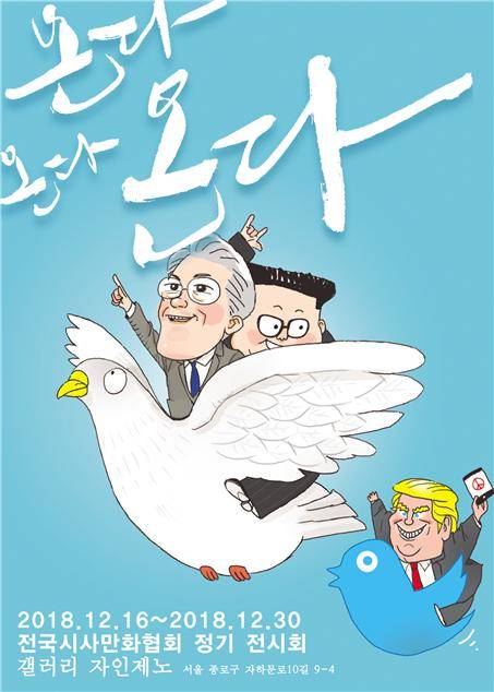 전국시사만화협회가 남북평화를 염원하는 기획전 <온다, 온다, 온다!>를 지난 16일 서울 종로구 갤러리 자인제노에서 오픈했다.