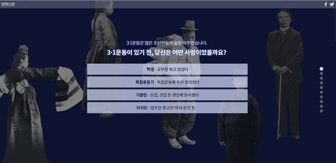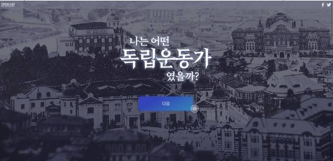 경향 뉴콘텐츠팀과 ‘다만세(다 같이 만들어온 세상) 100년’ 특별취재팀이 협업한 결과물은 이용자가 10개 질문에 답하면 그 선택과 가장 가까운 삶을 살았던 독립운동가 두 명을 매칭, 일치도 순으로 보여준다. 지난 17일 오픈한 해당 콘텐츠는 21일 오후까지 약 10만 명이 참여하며 높은 호응을 얻고 있다. 트위터와 페이스북 같은 SNS는 물론 루리웹, 오늘의유머 같은 커뮤니티에서도 결과를 공유한 이용자들이 다수 확인된다.