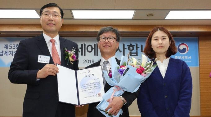뉴시스가 지난 4일 서울중부세무서에서 열린 ‘제53회 납세자의 날’ 시상식에서 기획재정부 장관상을 수상했다. 뉴시스는 3년간의 세무조사 유예, 납세유예시 담보면제 이용 등의 혜택을 받는다. 김형기<가운데> 뉴시스 대표이사는 “국가가 유지되기 위해서 꼭 필요한 두 기둥은 국방과 조세 시스템”이라며 “이번 시상식을 통해 뉴시스를 포함한 수상자 전원의 노력이 치하받았다고 생각한다”고 말했다.