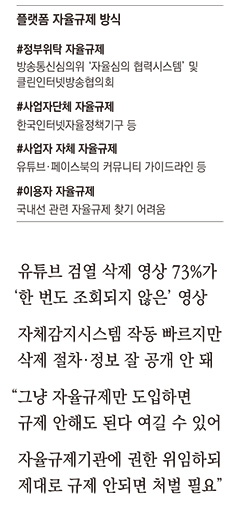 전문가들은 자율규제를 △정부위탁 자율규제 △사업자단체 자율규제 △사업자 자체 자율규제 △이용자 자율규제 등 총 네 가지 측면으로 구분하고 있다. 다만 사업자단체 자율규제의 경우 국내에선 2009년 한국인터넷자율정책기구(KISO)가 출범했지만 해외 플랫폼은 가입이 안 돼 있고, 이용자 자율규제의 경우엔 관련한 자율규제를 찾아보기 힘든 상황이다.