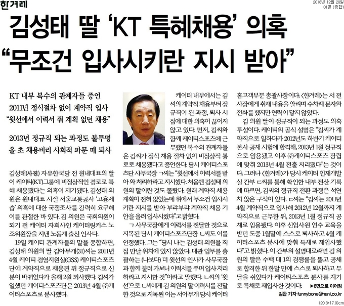 △한겨레신문 탐사에디터석 김완 기자, 24시팀 정환봉 기자 <김성태 국회의원 딸 등 KT 특혜 채용 의혹>