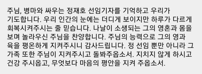 지난 23일 기도문에는 “우리 인간의 눈에는 더디게 보이지만 하루가 다르게 회복시켜주시는 줄 믿습니다. 나날이 소생되는 그의 영혼과 몸을 보며 놀라우신 주님을 찬양합니다. 주님의 능력으로 그의 영과 육을 평온하게 지켜주시니 감사드립니다. 그 가족 또한 주님이 지켜주시고 돌봐주옵소서. 지치지 않게 하시고 건강 주시옵고, 무엇보다 마음의 평안을 지켜 주옵소서”라는 내용이 담겼다.