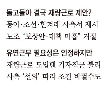조선일보와 한겨레신문사 사측도 재량근로제를 제시했다가 최근 노조로부터 거절을 당했다. 보상안과 준수대책이 미흡하다는 이유에서다. 한겨레의 경우 노조는 회사안 중 탄력·간주근로제는 일부 조건을 전제로 원칙적 찬성의 뜻을 밝혔지만 “기자직을 중심으로 도입을 요청한 재량근로제는 악용 우려가 커서 동의할 수 없었다”고 했다. 한겨레 사측은 당초 ‘주 44시간’, ‘주 42시간’, ‘주 40시간’ 근무로 편집국 부서·직무를 구분하는 재량근로 방식을 제안했다. 이 방식을 유지할지는 미지수지만 회사는 재량근로제 틀은 유지할 방침이다. 한겨레 관계자는 “재량근로제 시행을 포함해 전방위적으로 다양한 안을 고민하고 있고 6월 시범실시 여부 등도 검토 중”이라고 했다.