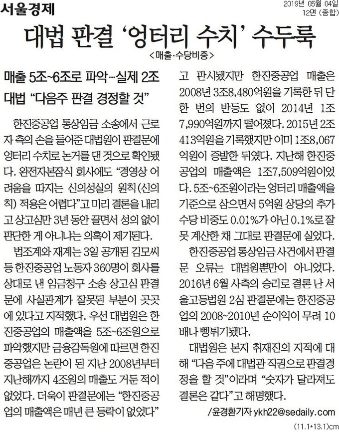 △서울경제신문 사회부 윤경환 기자 <대법원 한진重 통상임금 ‘엉터리 판결’>