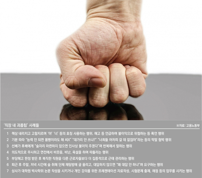 오는 7월16일부터 ‘직장 내 괴롭힘’을 금지하는 개정 근로기준법이 시행된다. 그렇다면 어떤 행위가 직장 내 괴롭힘일까? 고용노동부가 지난달 배포한 ‘직장 내 괴롭힘 판단 및 예방·대응 매뉴얼’을 참고해 대표 예시를 소개한다.