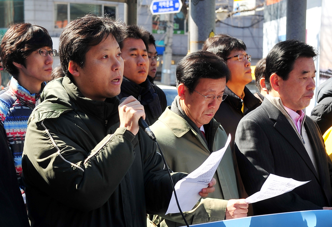 사진은 이날 오전 여의도 방송센터 1층 민주의 터에서 파업 출정식을 연 300여명 MBC노조 조합원의 모습들. 위 사진 가장 오른쪽, 카메라를 든 사람 바로 왼쪽에 구호를 외치는 이 기자가 보인다. 아래 사진은 2012년 3월12일 오전 서울 청운동 주민자치센터 앞에서 전국언론노동조합 주최로 열린 '낙하산 김재철 투입 청와대 해명 촉구 기자회견'에서 이 기자(MBC 노조 홍보국장)이 성명서를 낭독하는 모습.